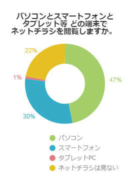 また、以前はHPを見るのはパソコンが主流でしたが、現在はタブレットやスマホが増加傾向にあるようです。特にスマホは外出時でも手元で簡単に閲覧できるというメリットがあり、重宝されているようです。中にはパソコンでのチラシ閲覧よりもタブレットやスマホでの閲覧率が高まり、その割合が60%近くまで伸びている店舗もあるようで、今後の販促を考えると見逃せない存在といえるでしょう。